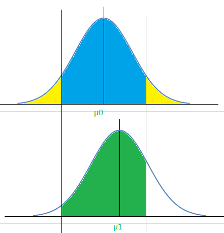 假设总体均值的真实值是μ1,也就是总体均值的抽样分布是下面正态分布(但很可惜,它到底是什么值我们是不知道的,如果知道了,假设检验也就没必要了)。我们给出的原假设是总体均值为μ0,也就是我们假设样本均值的抽样分布服从上面的正态分布。两侧的黄色区域面积之和是,也就是我们犯第Ⅰ类错误的概率。假设检验的依据就是看我们取到的样本均值是不是位于蓝色的区域中。如果样本均值位于蓝色区域,那么我们不能拒绝原假设,反之,拒绝原假设。好了,你可以先想想样本均值位于蓝色区域的概率是多少,想清楚了再往下看。