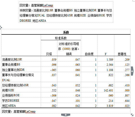 上述分析结果中输出的大部分表格和线性回归输出的表格基本一致,有所区别的是最优尺度回归多了一个相关性和容错表。此表中最主要的是重要性这一列的数据,它是根据标化系数和相关系数计算出的自变量在模型中的重要程度的百分比,所有变量的重要性加起来等于100%,数值越大表明该变量对因变量的预测越重要。可见,公司规模(SIZE)这个变量对高管薪酬(LnComp)的影响最大,其影响程度达到了88.7%,而其他自变量对高管薪酬(LnComp)的影响均不足10%,说明其他自变量对高管薪酬的影响极其微弱。显然,这与《含有虚拟变量的回归分析》一文中采用哑变量进行回归分析的结果是一致,读者可自行对比两者的结果。