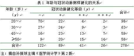 例如研究年龄与冠状动脉粥样硬化等级之间的关系,将278例尸解资料整理成表1。问年龄与冠状动脉粥样硬化等级间是否存在线性变化趋势?