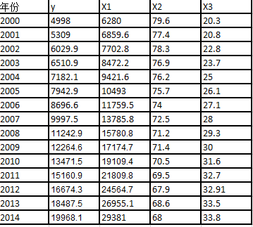 本文使用的数据如下图,y为城镇居民年人均消费性支出,城镇居民的年人均可支配收入X1、消费意愿(支出占收入比)X2、人均住宅建筑面积X3