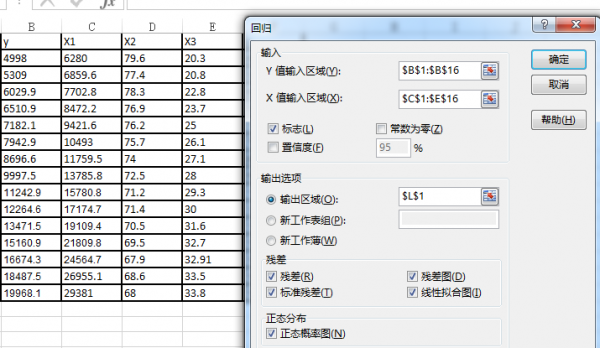 什么?你说一元线性回归太简单了,不够高级!那接下来我们看看多元回归。仍然是同一个对话框。只不过在自变量框里选择多个自变量。