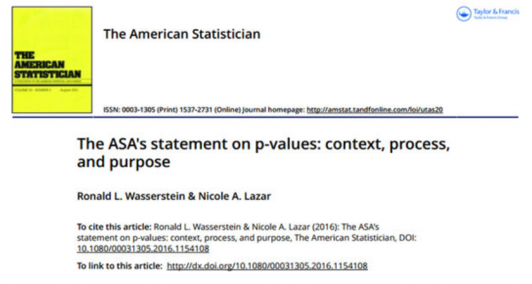 2016年3月,美国统计协会(ASA)正式发布了一条关于P值的声明:"The ASA's statement on p-values: context, process, and purpose",并提出了6条使用和解释P值的原则。
