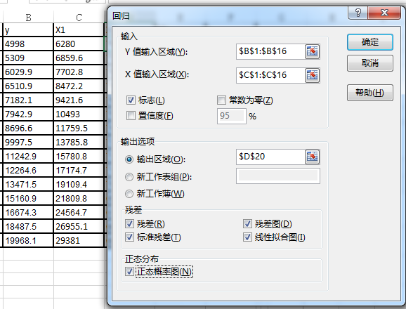 什么?你说一元线性回归太简单了,不够高级!那接下来我们看看多元回归。仍然是同一个对话框。只不过在自变量框里选择多个自变量。