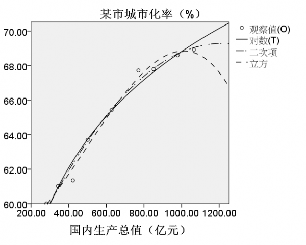 散点图的结果表征了国内生产总值与某市城市化率之间的曲线关系。从散点图的趋势来看,考虑的模型有对数曲线模型、二次曲线模型和三次曲线模型。于是后续采用曲线估计分别建立这3个模型,并从中挑选出最佳的模型。